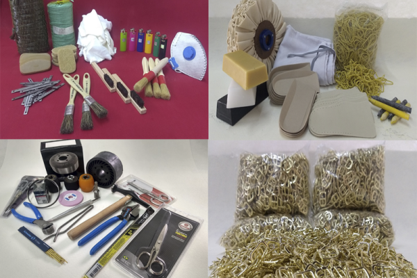 Além da nossa linha de Componentes como: colas, tachas, grampos, espumas, lixas, linhas, baguetes, fitas, recouro italiano e muito mais.